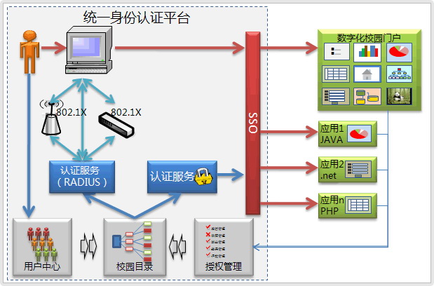 如图2所示,统一身份认证平台通过建立院校权威的用户信息,提供基于目录的高效的认证服务,对各类应用采用不同方式进行认证集成,实现用户采用一套用户名和密码即可访问不同应用系统的效果,在WEB应用中,用户登录数字化校园时,须经过统一身份认证网关的身份验证,通过验证后用户进入数字化校园门户以及其它应用系统,基于单点登录(SSO)无需重复登录即可在应用间进行漫游。同时基于分级授权可有效控制用户对不同系统的访问操作权限。统一认证系统在保证系统整体安全性、可靠性的同时,为各级用户使用软件功能和信息资源带来很大便利。统一认证系统主要包括了用户中心、目录服务、统一身份认证网关、集中分布式的授权系统四大部分建设内容。