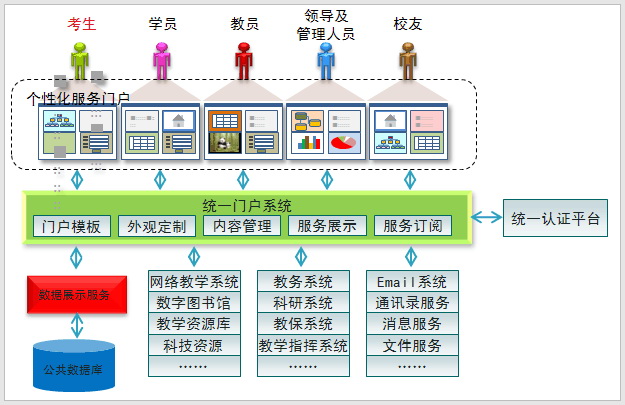 展现层由学校门户及各种内容管理系统构成。建成的项目实现整个系统的统一信息门户管理,包括对系统及角色的安全管理、身份认证管理、实现单点登录和统一权限管理。应用系统在信息门户的统一管理下进行功能操作和业务应用。