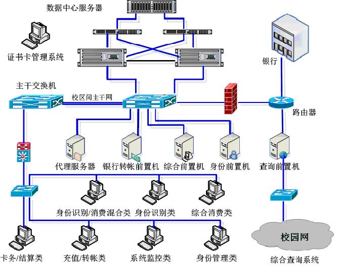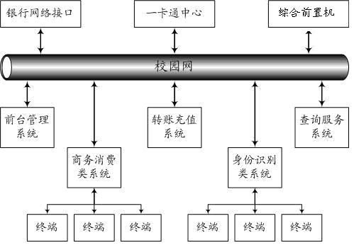 校园一卡通系统主干平台建立在校园网络上,分为数据中心和业务管理中心两大部分。