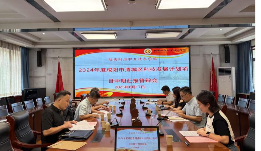 2025 年 6 月 17 日下午,咸阳市渭城区2024年度科技发展计划项目中期汇报答辩会在我校办公楼四楼会议室召开。咸阳市渭城区科学技术局项目评审专家李光涛、王长民及渭城区科学技术局相关科室负责人、我校科研处处长操龙升、方祎、项目负责人曹纳、张拓参加了会议。