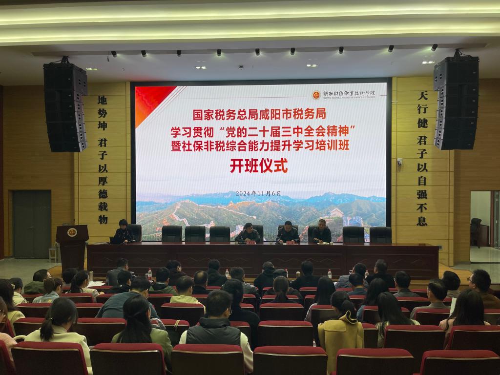 2024年11月6日-11月8日,为期三天的国家税务总局咸阳市税务局学习贯彻“党的二十届三中全会精神”暨社保非税综合能力提升学习培训在我校学术报告厅圆满举办。来自咸阳市税务局的49位学员参加培训。我校副校长王勇,市局党委委员、总经济师贾俊林出席开班仪式。